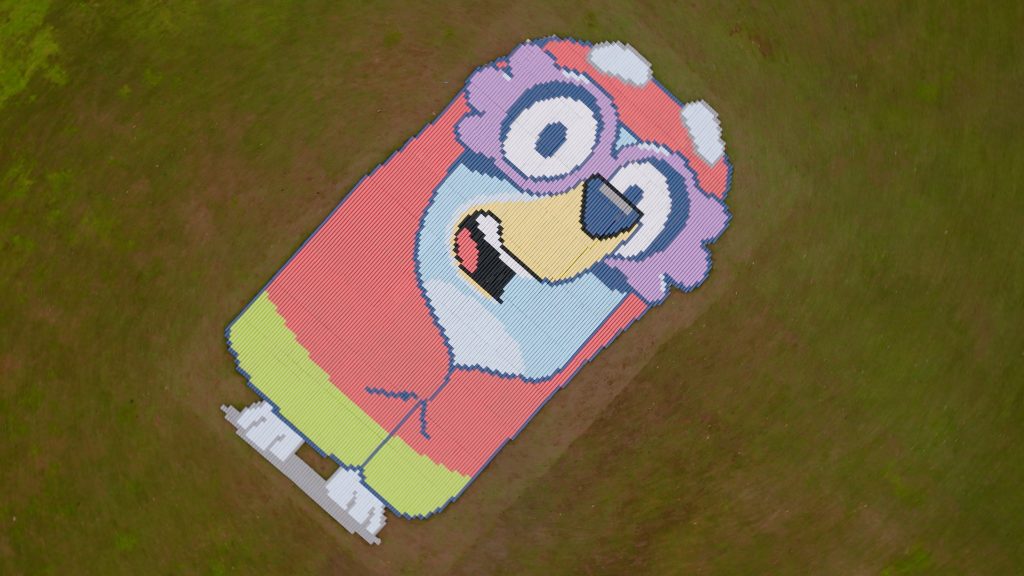 The artwork, which measures 20 by 15 metres and took 18 hours to complete, has appeared on the park’s iconic lawn, near CBeebies Land ahead of Bluey the Ride: Here Come the Grannies! officially opening on March 28.