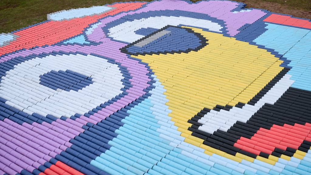 Featuring Bluey in her beloved granny disguise complete with headscarf, the installation comprises of approximately 11,494 cans of beans.