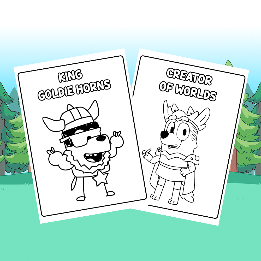 Get ready for the new adventure game! Colour in your favourite new characters including Bingoose, King Goldie Horns and the Creator of Worlds.