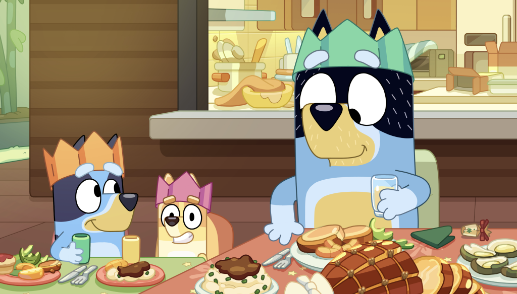 In episodes like Verandah Santa and Christmas Swim we see what a typical Christmas for Bandit Heeler looks like. There’s a lot of games (they often always involve tennis balls), festive headwear (whether that’s a Verandah Santa Hat or Christmas Cracker Crown) and a gravy filled feast fit for the big blue guy himself.