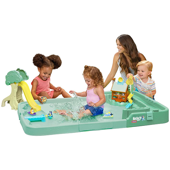 New way to play: Who says the fun has to stop with just water? Bluey, Bingo and Grandad use mud for camouflage when they’re hiding from mum, and there’s no reason this pond can’t get a bit muddy too. Just remember to hose everything off once play is over…kids included!