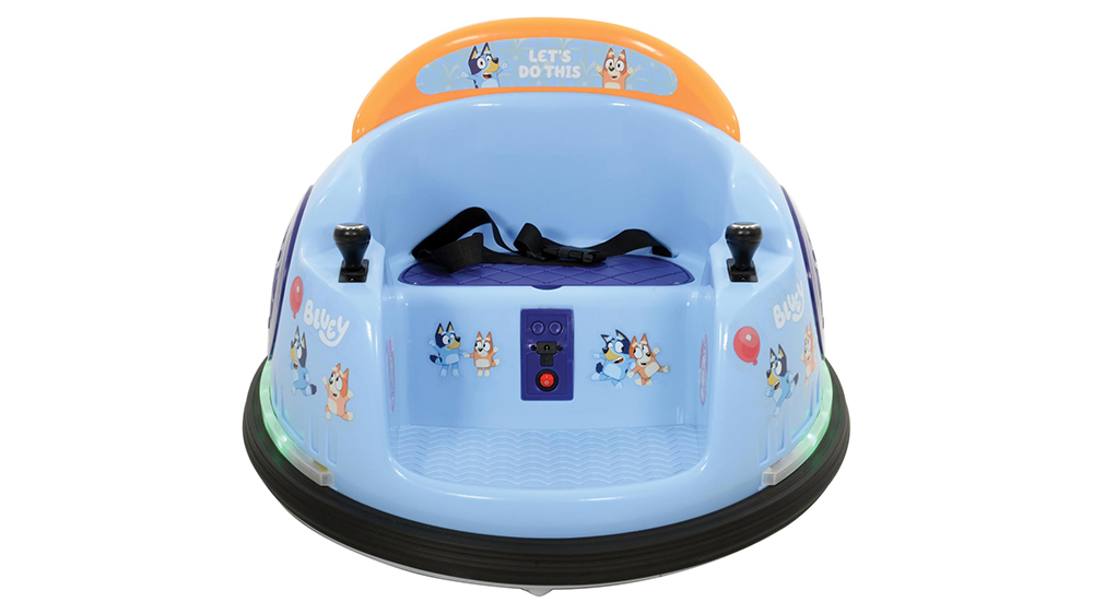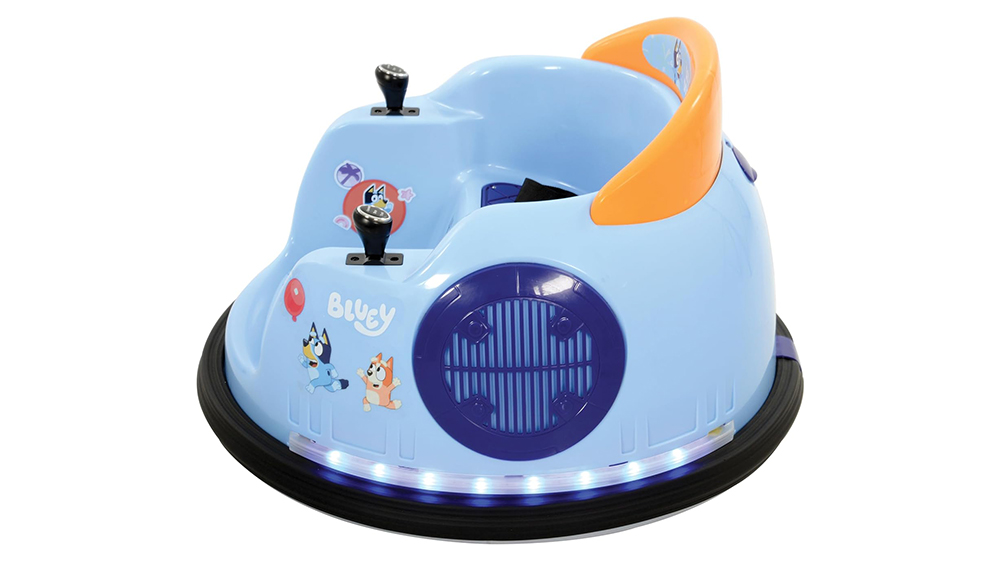 Bring all the fun of the fair home with this awesome Bluey bumper car. The compact ride-on is controlled via joysticks, allowing kids to spin around and move forwards and backwards at a safely controlled speed across flat surfaces. There are also built-in lights around the edge for added fun, creating rainbow patterns as the bumper car moves.
