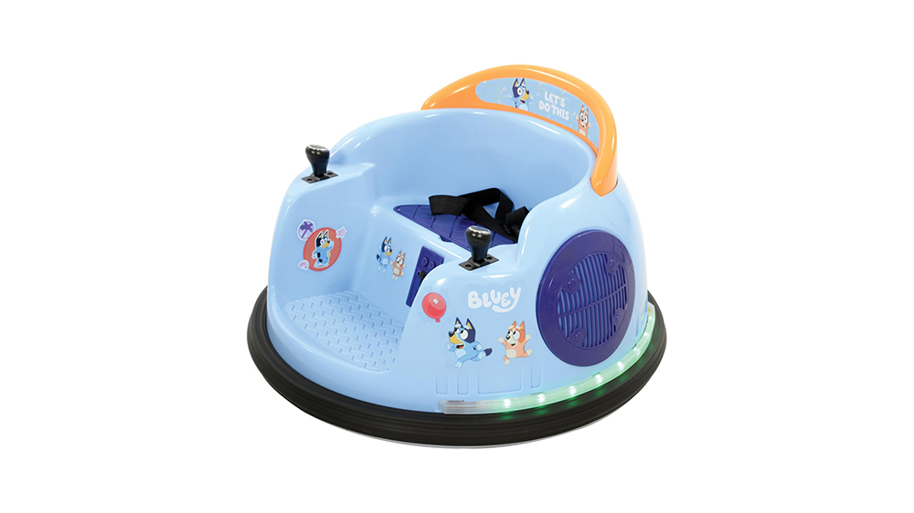 Bring all the fun of the fair home with this awesome Bluey bumper car. The compact ride-on is controlled via joysticks, allowing kids to spin around and move forwards and backwards at a safely controlled speed across flat surfaces. There are also built-in lights around the edge for added fun, creating rainbow patterns as the bumper car moves.