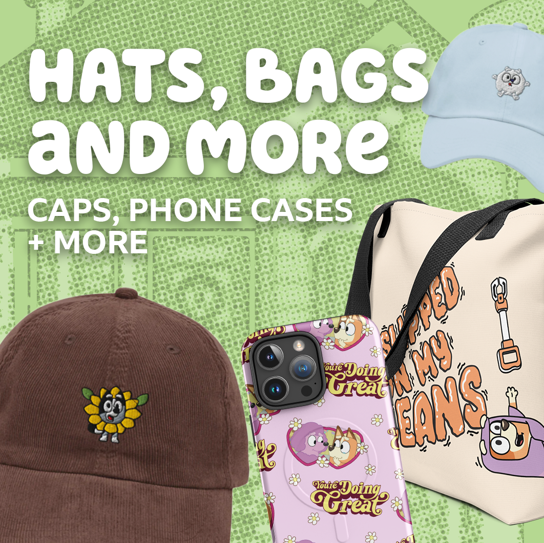 Whether it’s upon your head, shoulders (knees or toes) – wear your love of Bluey loud and proud with these caps, hats, bags and more wearables inspired by your favourite characters and episodes!