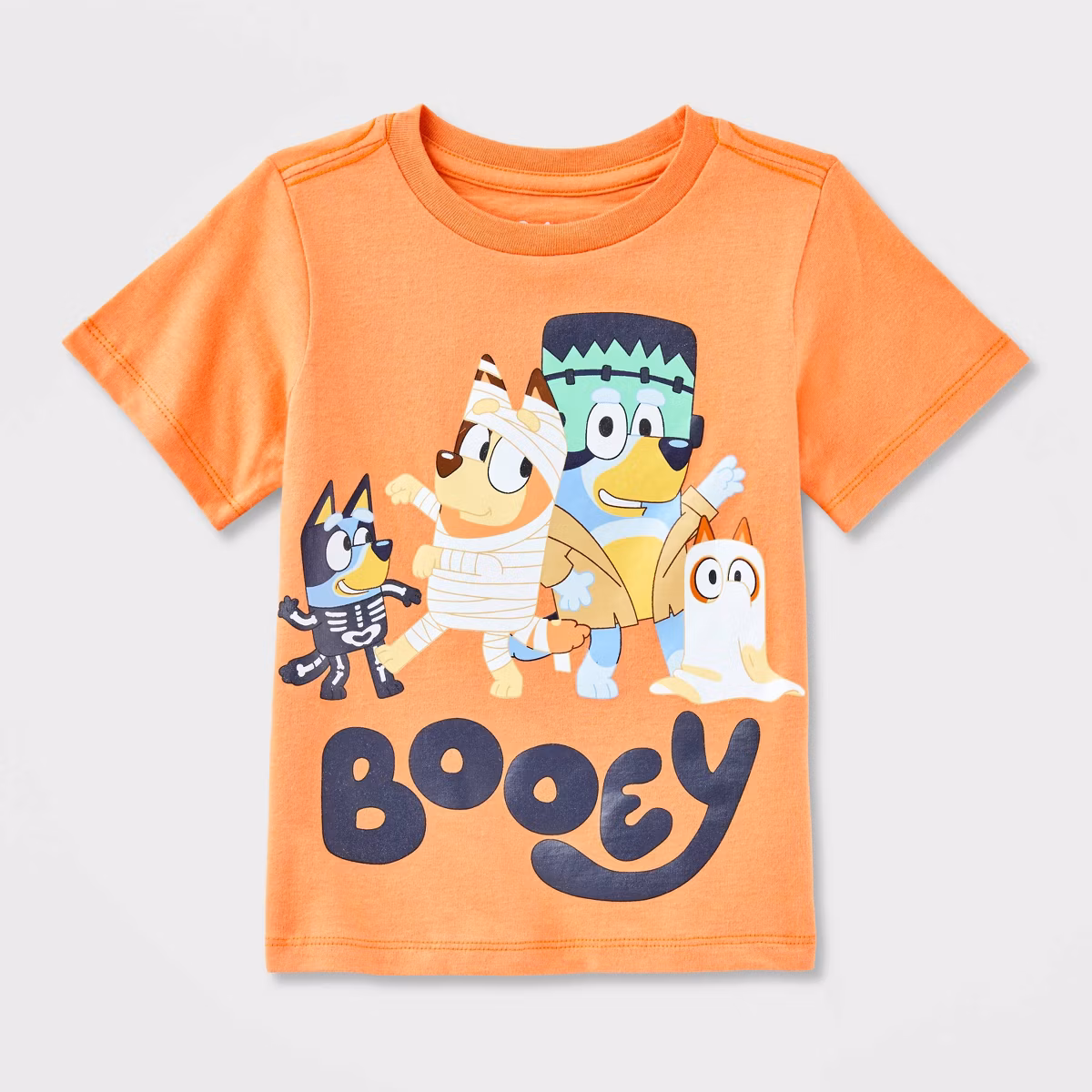 The whole Heeler family is decked out for Halloween on this cute “Booey” tee, which features Bluey in her skeleton costume, Bingo as a ghost, Mum as a mummy (what else?) and dad as Frankenstein’s monster. At less than $10, it makes a great gift in the run-up to Halloween to get kids in the mood for all things spooky!
