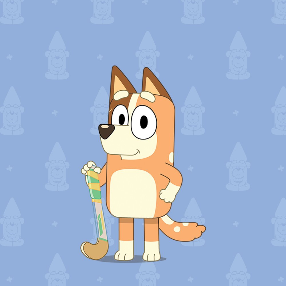 ソックスはブルーイとビンゴのいとこ。なめたり、かんだり、あかちゃんのくせがのこっているんだ。