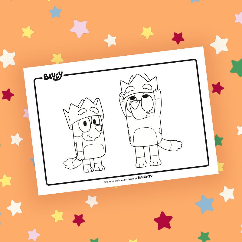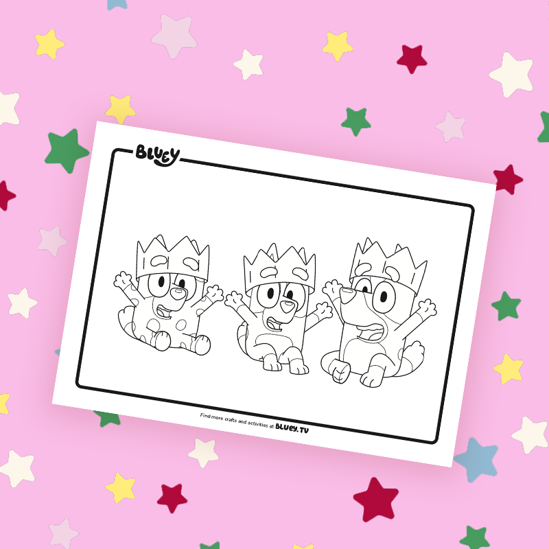 Bluey, Bingo and Muffin have popped on their Christmas Crowns! Grab some colours and make their holiday shine.