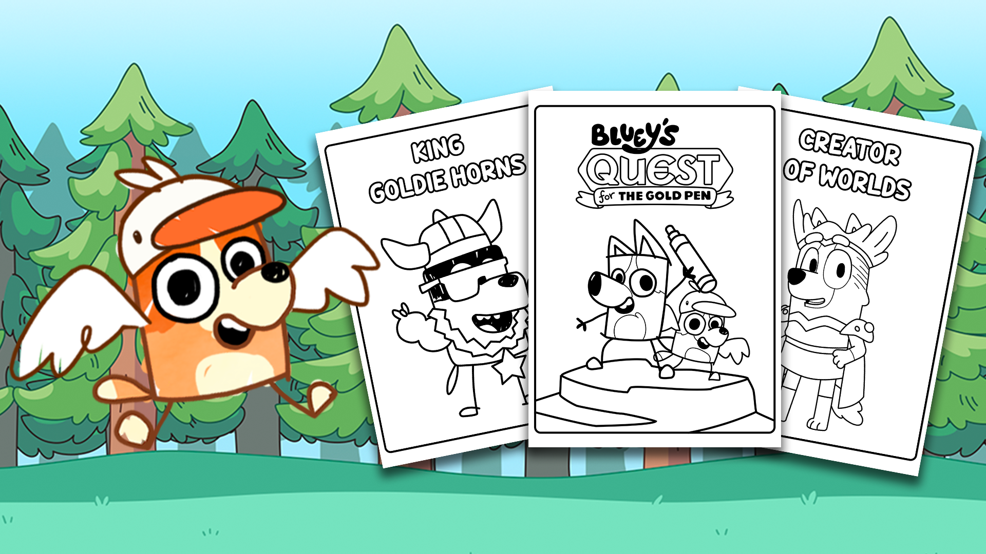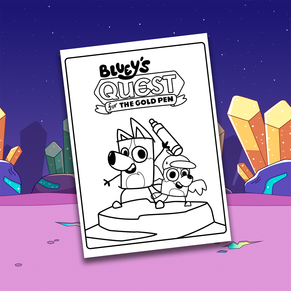 Join Bluey’s Quest for the Gold Pen with these colouring sheets!