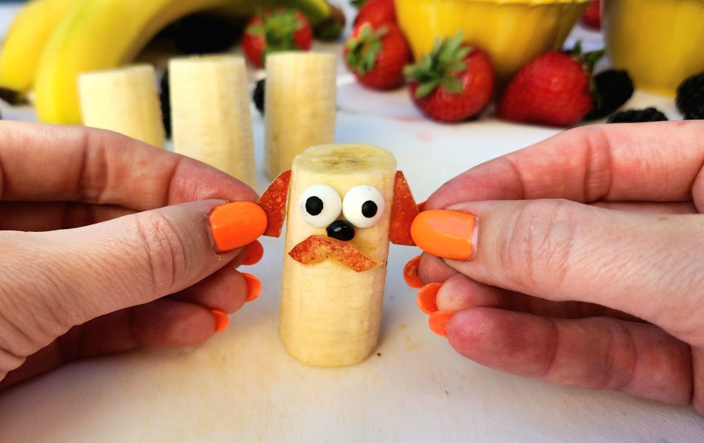 Use small pieces of rockmelon, nectarine, or any orange-coloured fruit to cut out doggy ears, eyebrows, and moustaches. Press them onto the banana. The fruit’s natural stickiness will help them stay in place. Stick on two candy eyes and a tiny blackberry segment for the nose. Fun fact – Each tiny segment of a blackberry is called a drupelet! - Add arms