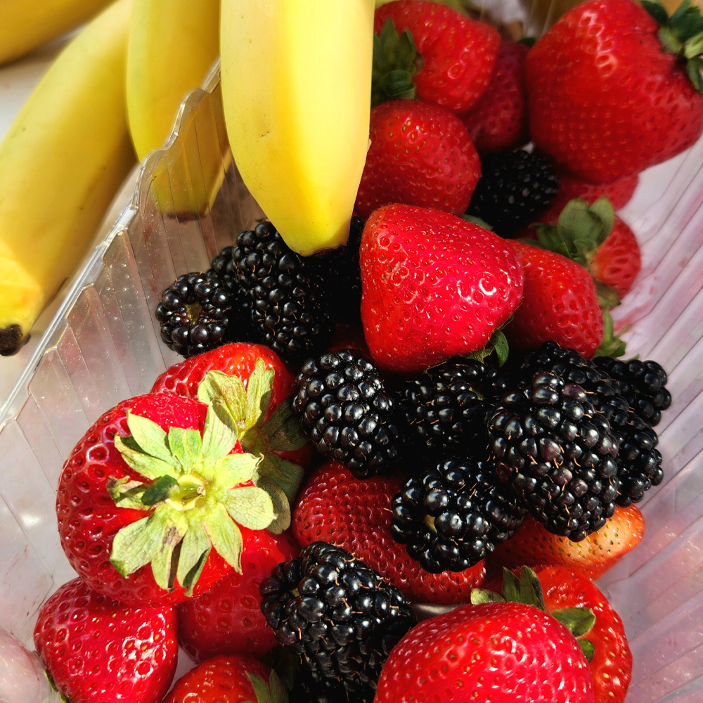 - A mix of orange or red fruits like rockmelon, nectarine, mango, apricot, or peach