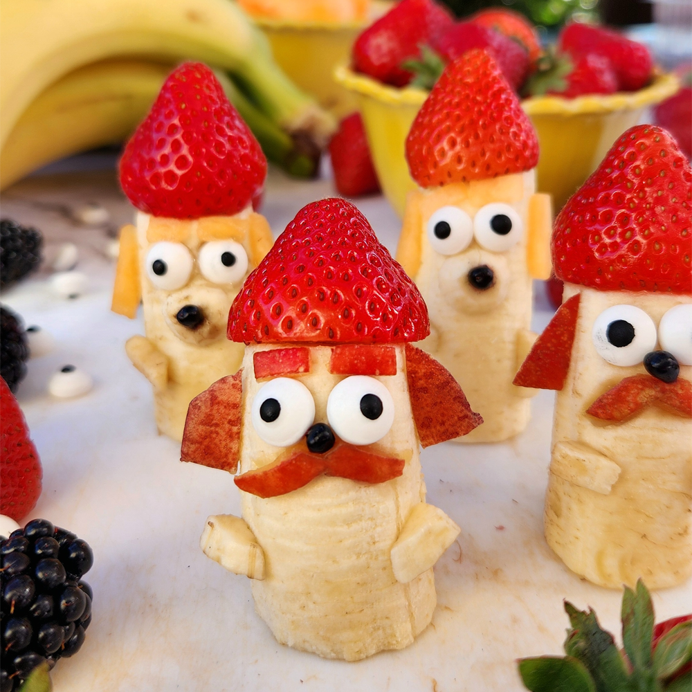 If any piece needs extra help sticking, gently push it into the banana so it holds firm. - Show off your fruity gnomes!