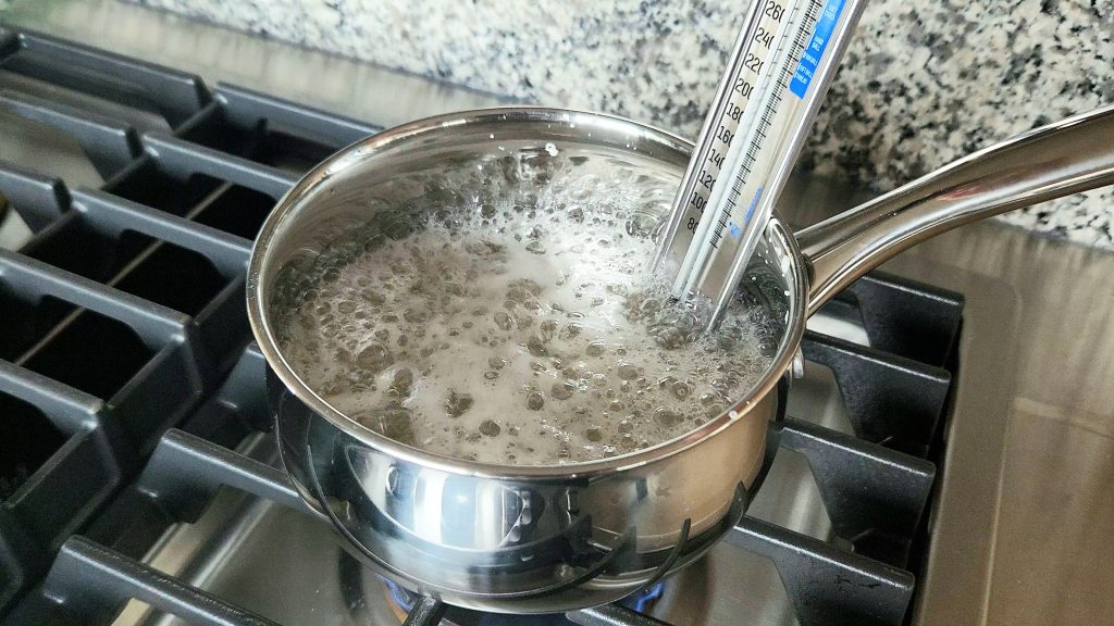 Remove from heat. When the bubbling slows, quickly stir in your flavouring. - Divide and colour