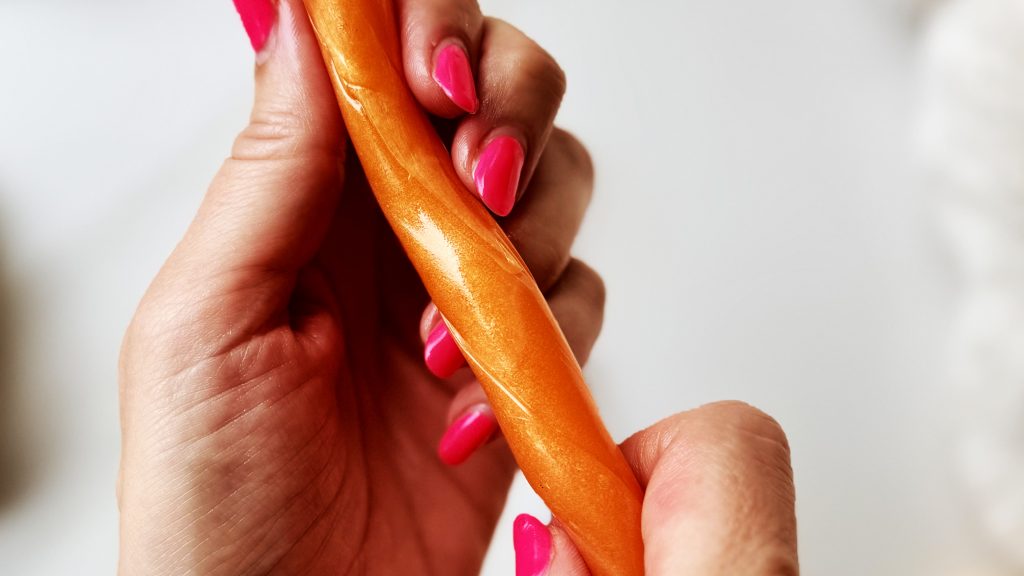 Butter up two sheets of baking paper (and your hands!) and pour the blue mixture onto one and the orange onto the other. Pop one colour in your warm oven so it stays pliable while you work on the other. Let it cool until the edges start to set but the middle still feels warm and bendy, like candy playdough.