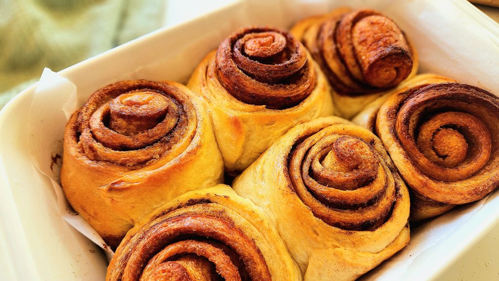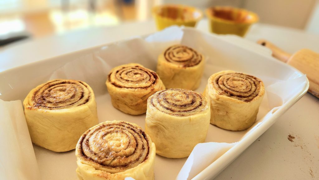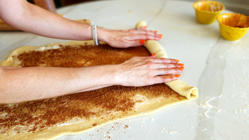 Roll it up from the short side into a log, trim the ends, and cut into 6 even pieces. - Second rise