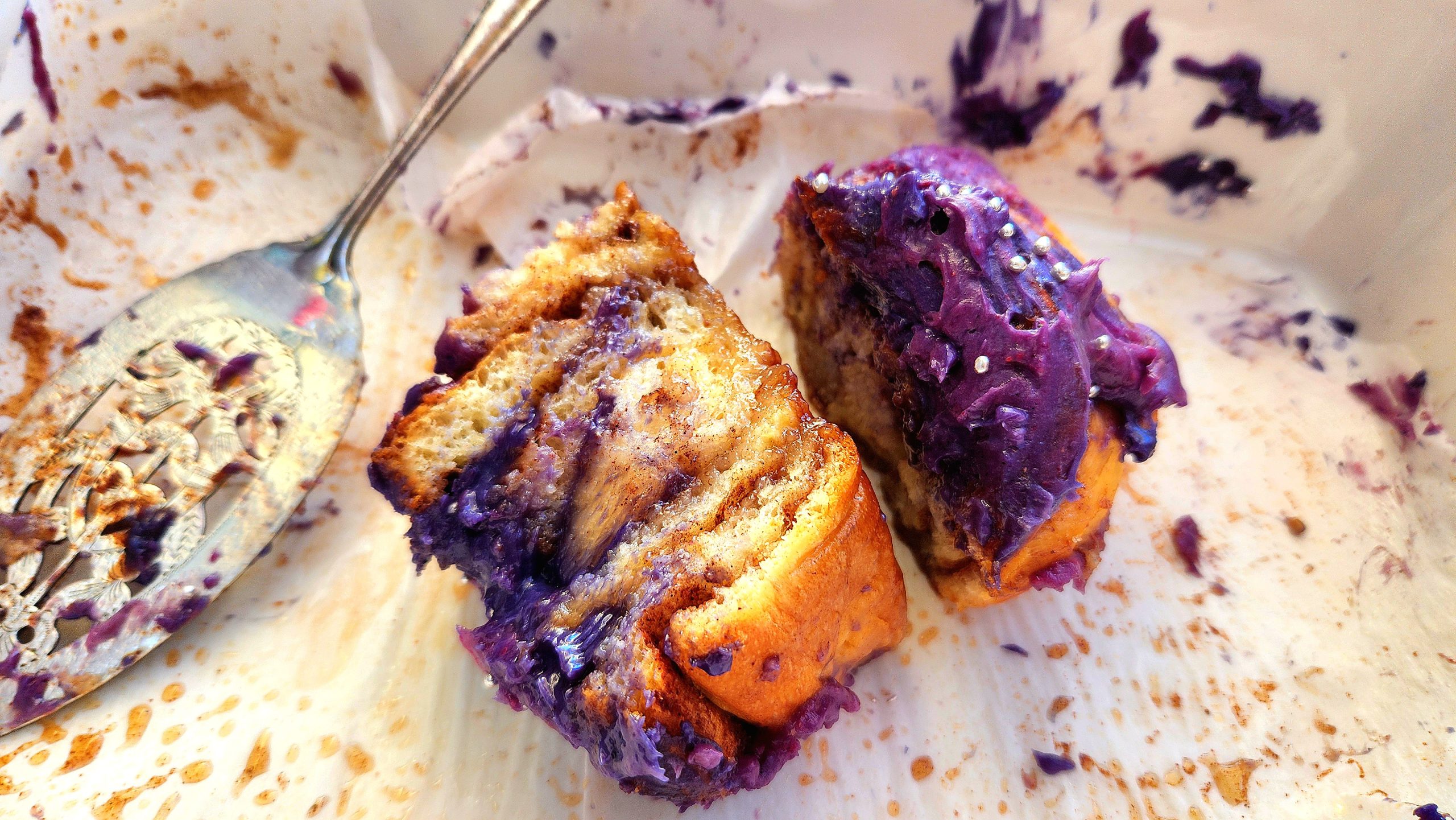Drop dollops of each colour over the warm rolls, swirl into a galaxy pattern, and finish with silver sprinkles for stars. - Serve warm, with big smiles and extra napkins!