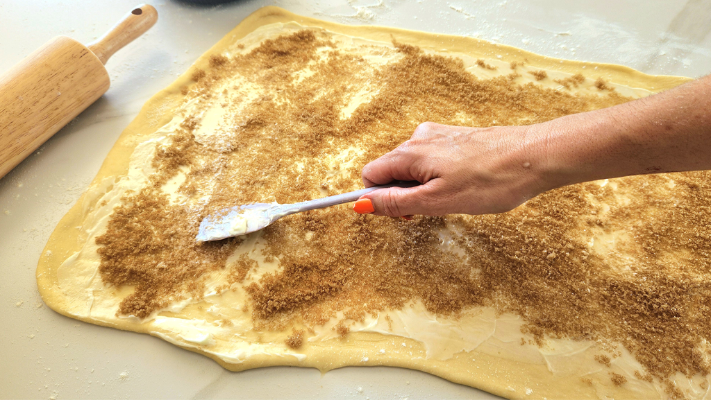 Spread on the butter, sprinkle the sugar and cinnamon, then smooth it all over. - Roll and slice