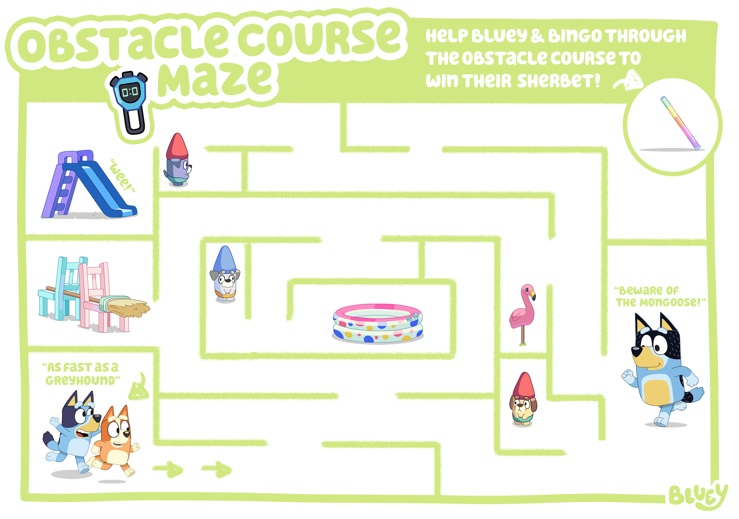 Help Bluey & Bingo through their backyard obstacle course to win their sherbet!