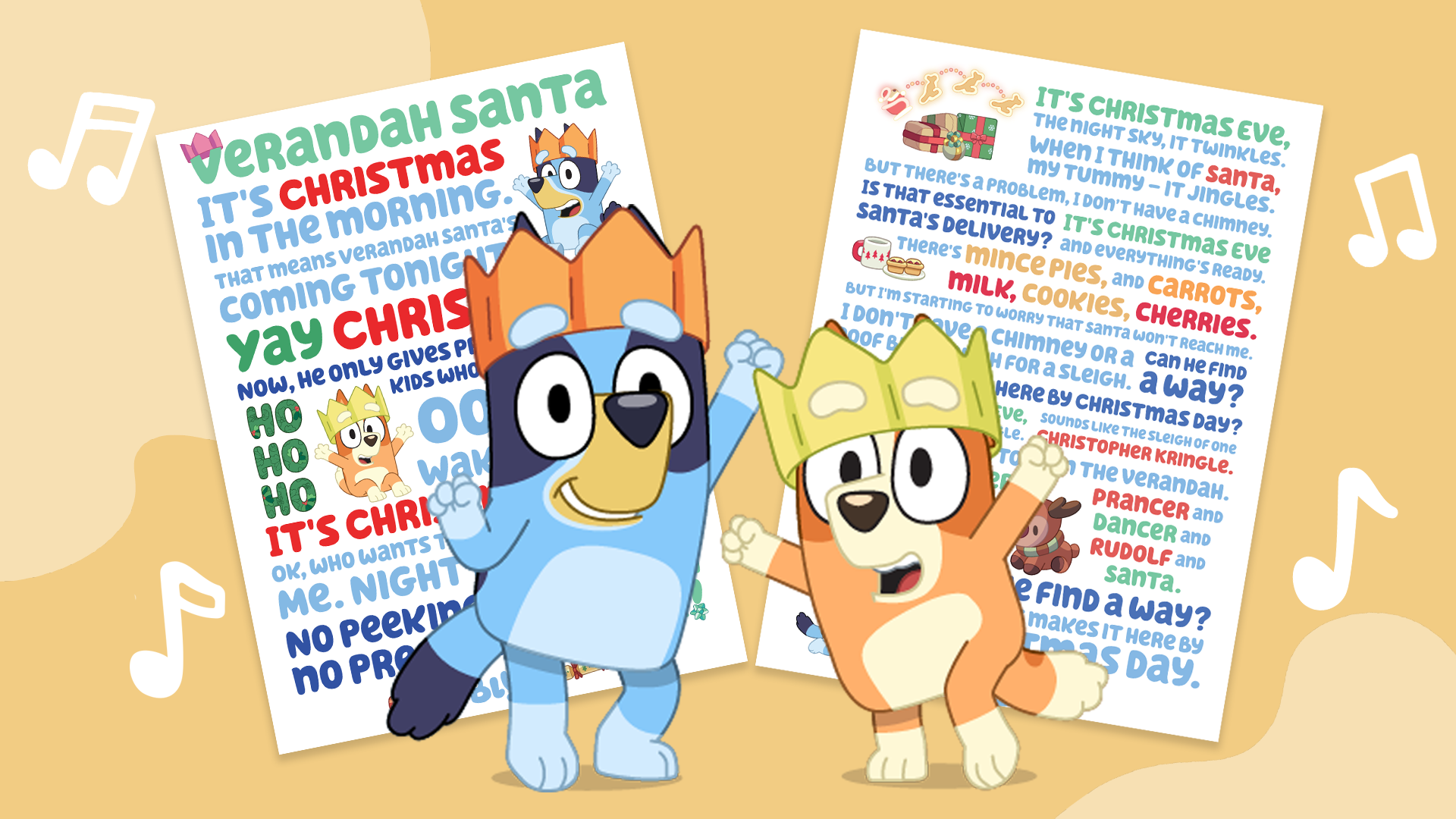 listen nowIt’s a Bluey Christmas! Have some festive fun with Bluey karaoke songs: the ‘Chimney song’ from and ‘Jingle Bells’ fro the bonus bit of the same name. You can sing along and learn the words by printing the lyric posters!