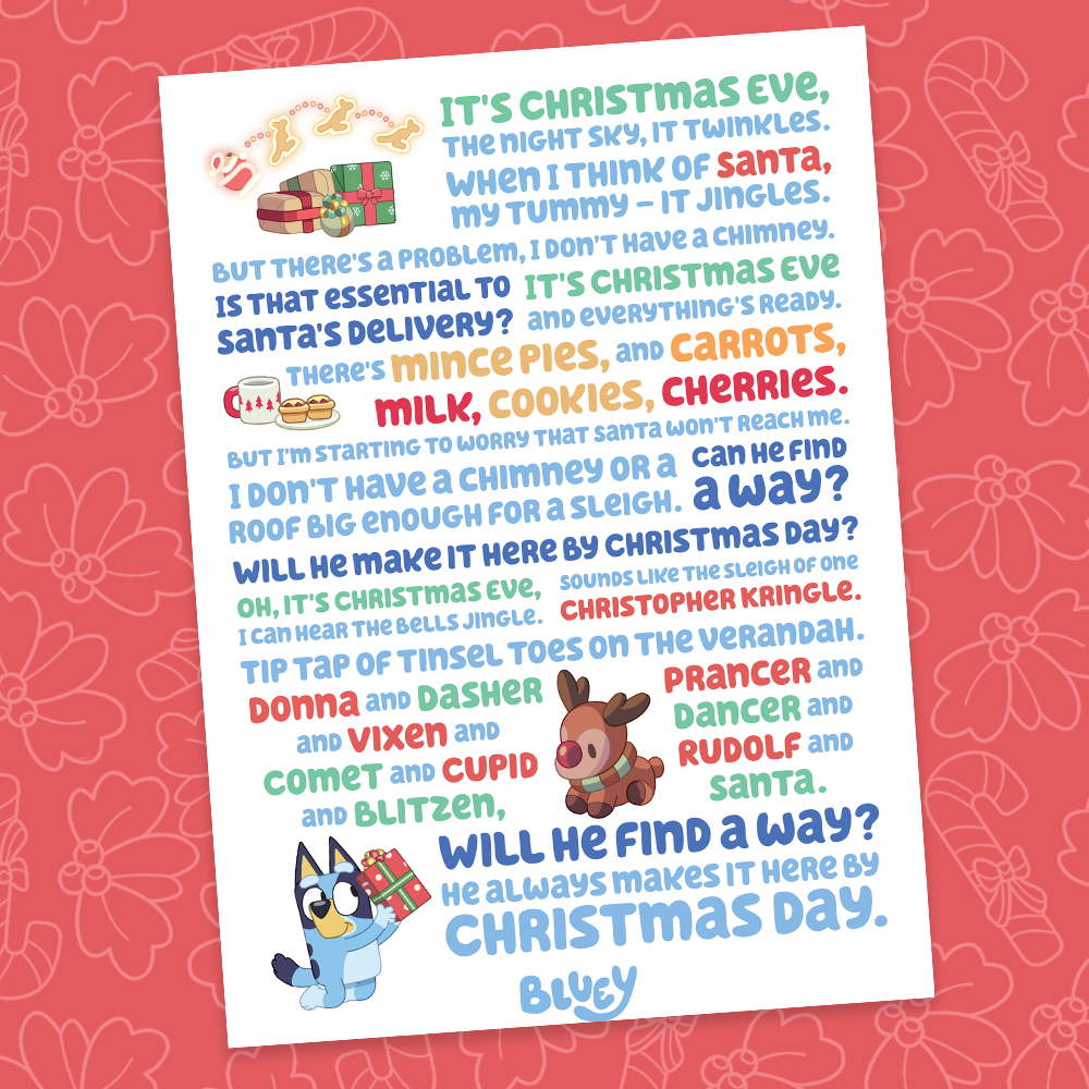 listen nowIt’s a Bluey Christmas! Have some festive fun with Bluey karaoke songs: the ‘Chimney song’ from and ‘Jingle Bells’ fro the bonus bit of the same name. You can sing along and learn the words by printing the lyric posters!